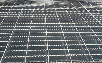 熱鍍鋅鋼格板是由負(fù)載扁鋼和橫桿按一定間距經(jīng)緯排列,在高壓電阻焊機上焊接而成原板,經(jīng)切割、切口、開孔、包邊等工序深加工而成客戶要求的成品。
